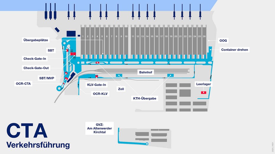 Erfassung von Daten und Containerstatus durch HHLA. Bei Anlieferung Interchange Receipt am Drucker entgegennehmen. Schranke öffnet nach Beendigung des Checkvorganges selbstständig.